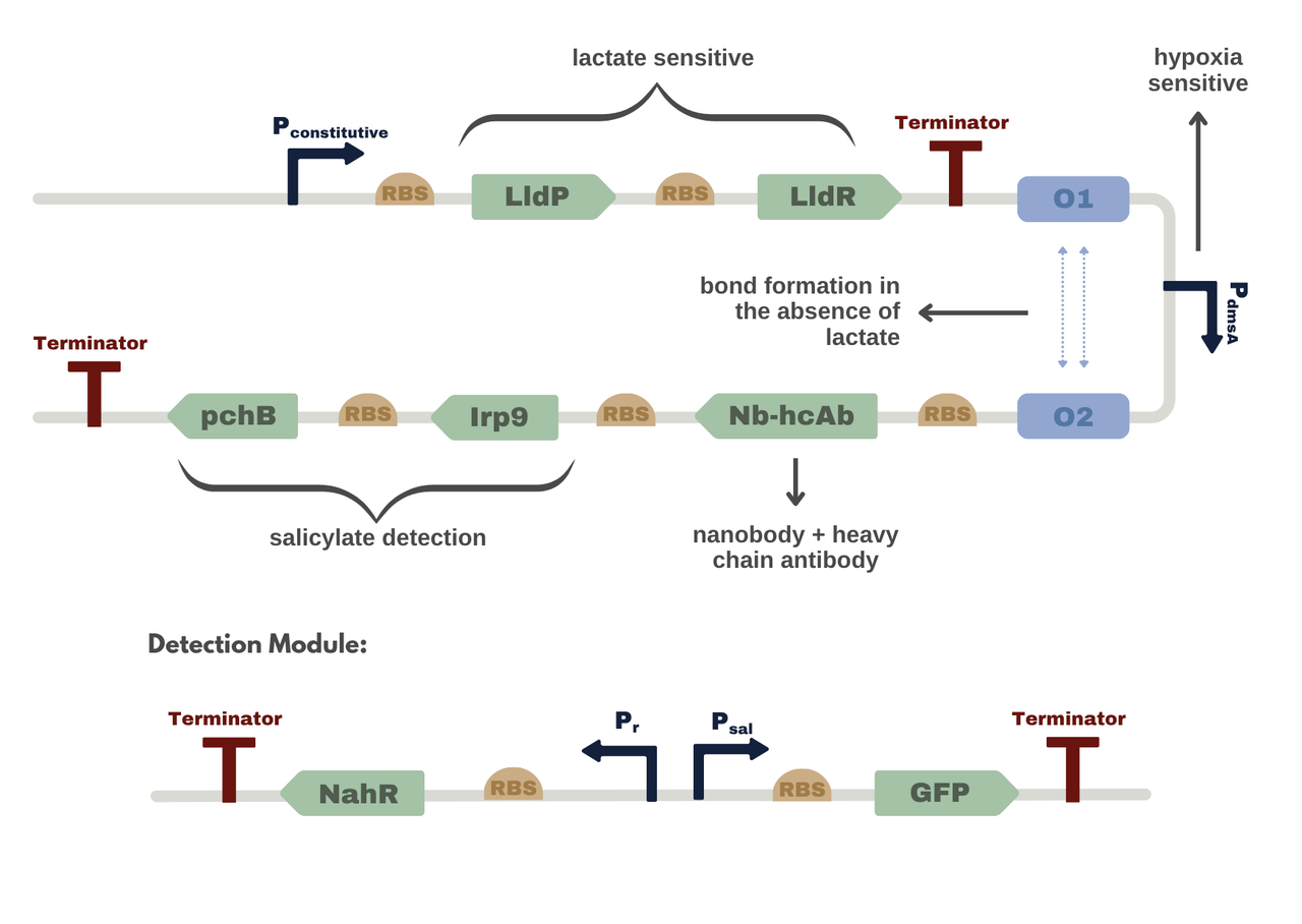At the heart of ReSET lies a biosensor circuit engineered to function as an AND gate, adapted from the lldPRD operon. This core module ensures that gene expression is activated only when both lactate and hypoxia — the hallmark conditions of the tumor microenvironment — are present, to prevent off-target killing. The LldR/LldP system acts as the lactate sensor, where high lactate levels lift LldR-mediated repression, while the PdmsA promoter drives expression specifically under hypoxic conditions. Together, these inputs tightly regulate downstream expression, ensuring precise tumor-restricted activation and eliminating off-target effects.