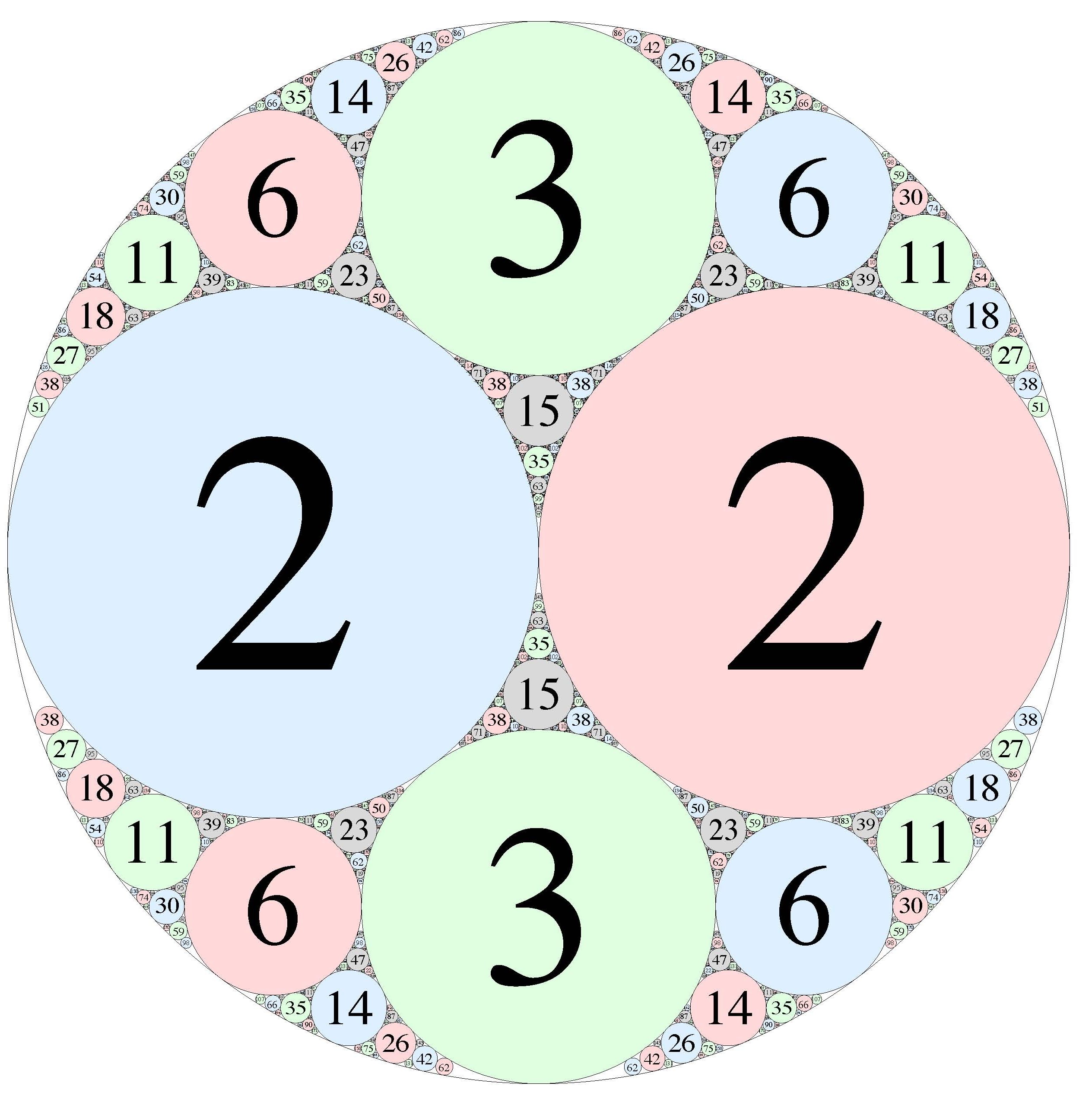 Here, the circles are supposed to have no common interior point which means by convention that the outermost circle’s exterior is the interior and the interior is the exterior and the radius is negative. Thus, if we are given 3 of the circles and they have integer curvatures, the fourth must also have integral curvature because of the equation! In the figure here, the curvatures are −1, 2, 2, 3.
